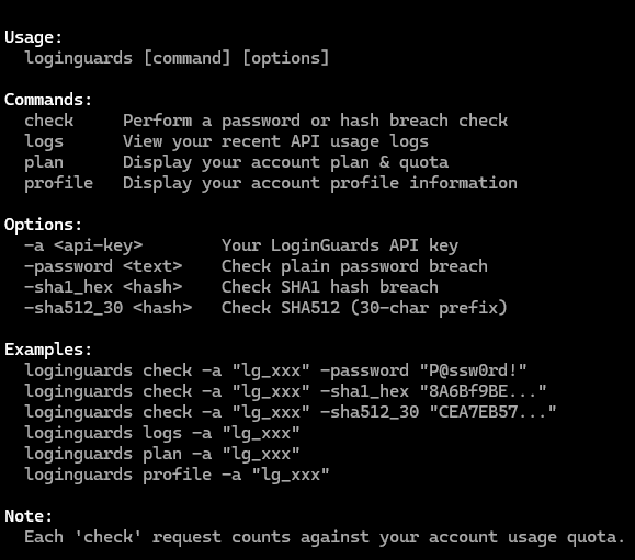 loginguards plan -a "<api-key>"loginguards profile -a "<api-key>"Usage Notes